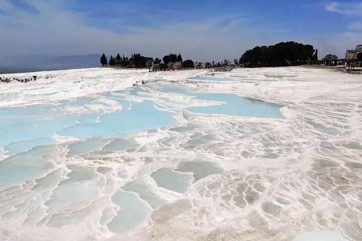 Then we continue our journey to Philadelphia, nowadays called Alasehir, another church of the Seven Churches of Asia [Rev. 1:11; 3:7], and the only church not censured. There we see the remains of a Byzantine basilica built of brick, with a bit of high arch and some 11th-century frescoes. Continue to visit Laodicea. The city established in the C3 BCE by the Seleucid Antiochus II, the city was named after his wife Laodicea. Built on the Lycus Tributary of the Meander River, it was surnamed Laodicea on Lycus, to distinguish it from other similarly named cities. Laodicea is the last of the seven churches. As a crossroads of two important roads, this city had an important commercial and logistical position. Then, visit the ancient city of Hierapolis & Pamukkale with the Theatre, Apollo Temple and magnificent Necropolis, the graveyard . and The travertine terraces at Pamukkale are one of the most spectacular natural wonders we ever have seen from various mineral springs in a vast white cliff side, about 200 m overlooking the plain, calcite-laden waters have dripped down over a series of terraced levels and created a fairyland of bizarre solidified cascades and shell-shaped basins. It looks like creations from snow or like balls from cotton, which gave the scenery the Turkish name Pamukkale (cotton castle): Moreover the water in the basins is changing its color according to how the light enters. Check-in at the hotel for dinner and overnight in a Thermal Hotel in Pamukkale.